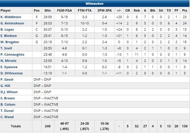 Milwaukee a usé d’un 10-2 pour prendre les commandes 56-48 à la pause puis 84-62 en milieu de 3ème quart suite à un 28-14 (9 points pour Bledsoe). New Orleans est revenu à 7 points en début de 4ème, mais les Bucks ont répondu par un 8-0 (113-98).