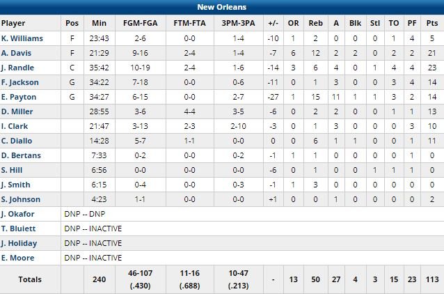 Giannis Antetokounmpo a signé 24 points (7/13, 10/10 aux lancers-francs, 9 rebonds et 5 passes) et son équipe a notamment marqué 45 points (à 41) dans le 3ème quart en plus d’avoir dominé le 2ème 33-25 et terminé le boulot dans le 4ème (29-24). À ses côtés Khris Middleton a terminé à 23 points, Malcolm Brogdon 18. Eric Bledsoe et l’ex-Pelican Nikola Mirotic ont tous les deux marqué 14 points. En face Julius Randle a terminé à 23 points, Anthony Davis 21 points et 12 rebonds, Elfrid Payton a lui réussi son 2ème triple-double d’affilée (première dans la franchise depuis Chris Paul en 2008) avec 14 points, 15 rebonds et 11 passes.