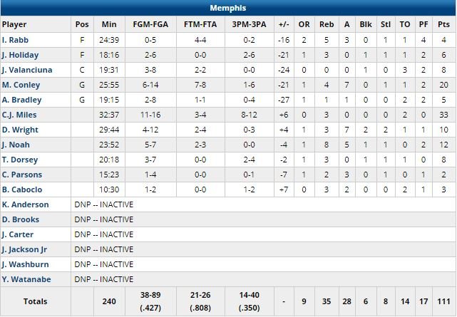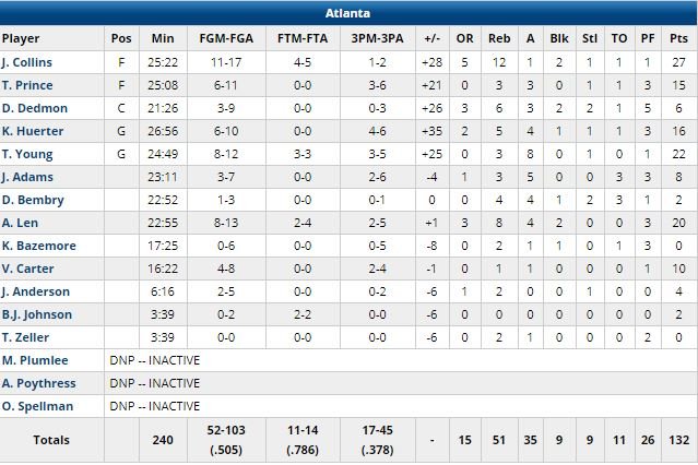 C.J. Miles et Mike Conley ont terminé meilleurs marqueurs pour Memphis avec respectivement 33 (record en saison) et 20 points. Meilleure défense au nombre de points encaissés depuis le All-Star break avant le match (meilleure attaque dans les mêmes conditions pour les Hawks), Memphis a pris 72 points en 1ère mi-temps et comptait 11 points de retard à la pause.
