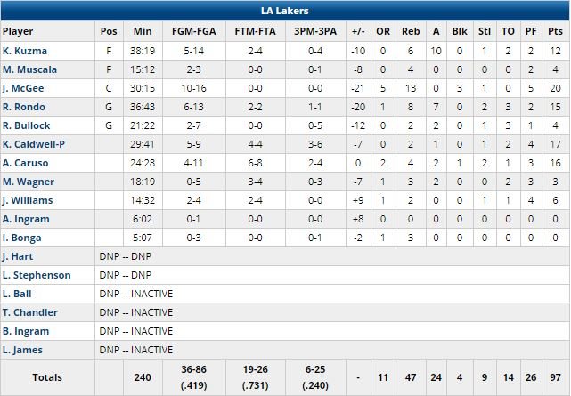 Jackson a terminé à 20 points à 6/19, 5 rebonds et 5 passes, Langston Galloway 23 (8/10), Andre Drummond 19 points à 8/15, 23 rebonds et 2 contres et Blake Griffin 15 points à 3/12 et 9 rebonds. Chez les Lakers, un joueur atteint les 20 points : JaVale McGee (10/16, 13 rebonds, 3 contres). Los Angeles a terminé à 6/25 à 3-points, contre 17/39 pour ses adversaires.