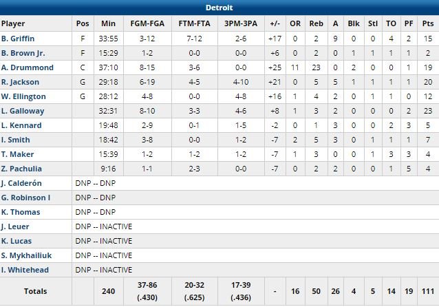 Jackson a terminé à 20 points à 6/19, 5 rebonds et 5 passes, Langston Galloway 23 (8/10), Andre Drummond 19 points à 8/15, 23 rebonds et 2 contres et Blake Griffin 15 points à 3/12 et 9 rebonds. Chez les Lakers, un joueur atteint les 20 points : JaVale McGee (10/16, 13 rebonds, 3 contres). Los Angeles a terminé à 6/25 à 3-points, contre 17/39 pour ses adversaires.
