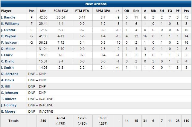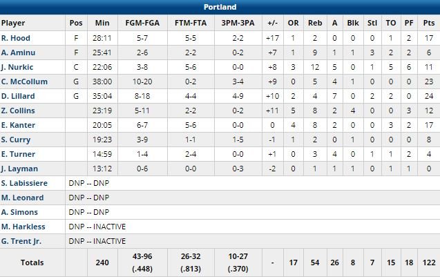 3/3 pour les Blazers, vainqueurs des Pelicans 122-110 malgré le nouveau record en carrière de Julius Randle (45 points à 20/34, 11 rebonds, 6 passes, 3 contres, 2 interceptions) mais avec un Damian Lillard passé 2ème meilleur scoreur de l’histoire de sa franchise (12 584 points) devant LaMarcus Aldridge (12 562 points) avec 23 points à 8/18, 4 rebonds et 7 passes.