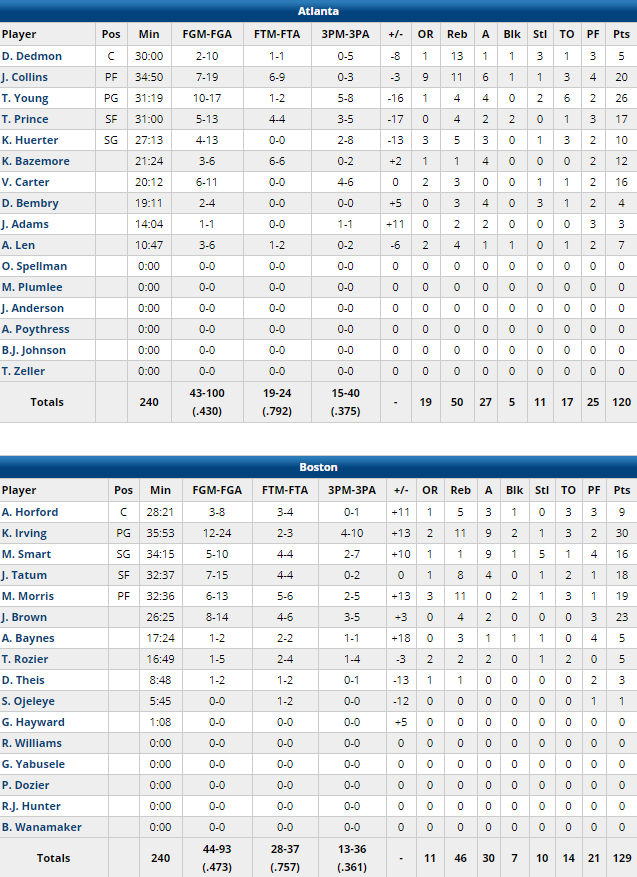 Kyrie Irving est une nouvelle fois l’homme du match avec 30 points à 12/24 dont 4/10 à 3-pts, 11 rebonds, 9 passes, 2 contre et 1 interception en 36 minutes. Il a été épaulé par un super Jaylen Brown, auteur de 23 points à 8/14 dont 3/5 à 3-pts, mais aussi un excellent Marcus Smart (16 points à 5/9, 9 passes, 5 interceptions). Marcus Morris et Jayson Tatum apportent leur pierre à l’édifice avec respectivement 19 et 18 points. A noter que Gordon Hayward a dû quitter ses coéquipiers dès le premier quart, touché au nez sur un choc avec John Collins. En face les Hawks ont encore une fois pu compter sur un Trae Young très chaud, auteur de 26 points à 10/17 dont 5/8 à 3-pts et 4 passes. Collins compile 20 points à 7/19, 11 rebonds et 6 passes alors que Taurean Prince ajoute 17 points à 5/13 et Vince Carter brille encore avec 16 points à 6/11 dont 4/6 à 3-pts.