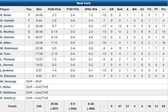 LaMarcus Aldridge a terminé à 18 points à 8/14 et 11 rebonds sans forcer en 26 minutes, DeMar DeRozan et Bryn Forbes ont ajouté 13 points. Pour New York (16 ballons perdus, 41% aux tirs), sans Dennis Smith Jr. (dos), c’est une 8ème défaite de rang. Damyean Dotson a signé 21 points, DeAndre Jordan 11 points, 13 rebonds et 9 passes (record en carrière égalé). Légèrement amaigri mais de retour après une grippe et 2 matchs d’absence, Rudy Gay a joué 19 minutes pour 12 points.