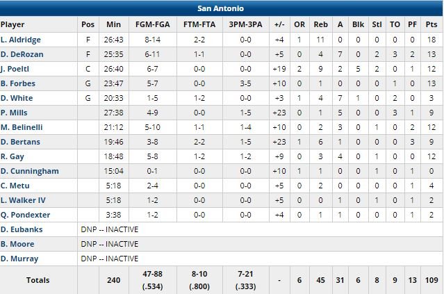 Les Spurs (48 points dans la peinture) ont pris 11 points d’avance dès le 1er quart-temps et se sont maintenus dans la dizaine de points d’avance tout au long du match ou presque. Menés 76-67, les Knicks ont eu l’occasion de se rapprocher sur un layup de Kadeem Allen mais ce denier, gêné par Aldridge, a manqué la cible et Gay a planté un 3-points derrière (79-67). Titulaire au poste 5, Jakob Poeltl a signé 12 points à 6/7, 9 rebonds et 5 contres en 26 minutes pour San Antonio.