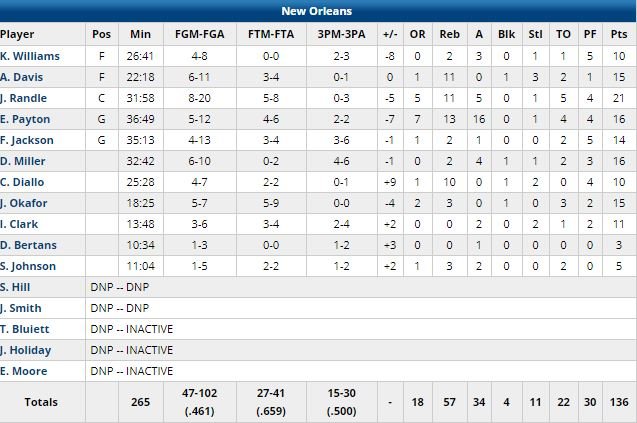 Anthony Davis, 15 points, 11 rebonds et 3 interceptions en 22 minutes, a quitté le match (dans le cadre de sa limitation de temps de jeu suite à sa demande de transfert) à 5’15 de la fin du 3ème quart, son équipe menée 80-75.