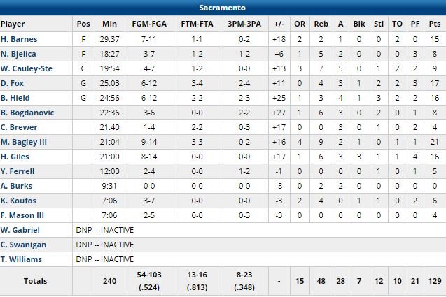 Marvin Bagley III et Harry Giles sont les deux jeunes à s’être le plus démarqués dans ce match avec respectivement 21 points à 9/14 et 9 rebonds et 16 points à 6/14, 6 rebonds, 3 passes et 3 contres en seulement 21 minutes de jeu. De’Aaron Fox a terminé à 17 points à 6/12, 4 rebonds et 3 passes, Buddy Hield 16 points à 6/12 (2/3 à 3-points, encore 10 tirs primés et il battra le record de Peja Stojakovic, 240 tirs à 3-points réussis en 2003-04) et 4 passes. Zach LaVine a été tenu à 18 points à 7/18 dans cette 5ème défaite consécutive des Bulls.