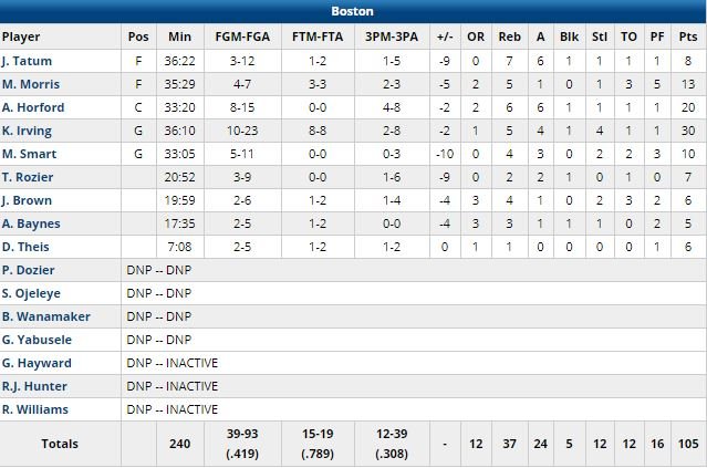 Les deux équipes ont combiné pour 107 points sur les 24 premières minutes, Denver en tête 55-52. Irving a démarré son match sur un 1/9 aux tirs mais Horford a tenu la baraque avant que le meneur ne retrouve la mire. Jayson Tatum a été limité à 8 points à 3/12, 7 rebonds et 6 passes. Michael Malone a fait plaisir à Isaiah Thomas et au public du TD Garden en faisant rentrer l’ancien Celtic 6 minutes et 50 secondes alors qu’il l’avait sorti de sa rotation depuis 3 matchs. Gordon Hayward (commotion) n’a pas joué.