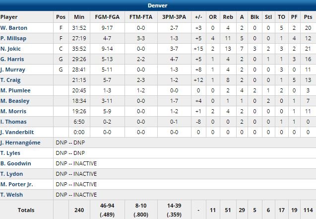 Pour les Celtics, 5èmes à l’Est et menés par les 30 points (10/23, 5 rebonds, 4 passes) de Kyrie Irving et les 20 points, 6 rebonds et 6 passes d’Al Horford, c’est une 2ème défaite en 7 rencontres. Le match est resté serré jusque dans le 3ème quart-temps, durant lequel aucune des deux équipes n’a pris plus de 2 possessions d’avance. Les Nuggets se sont finalement détachés 106-94 à 3’47 de la fin du match, mais Boston a répondu par un 5-0 pour revenir à 5 points. Barton a stoppé le run avec un layup et suite à un 3-points manqué par Horford de l’autre côté, Paul Millsap (12 points à 4/7, 11 rebonds et 5 passes) a redonné de l’air aux siens (112-101) à 31.3 secondes avec un 3+1.