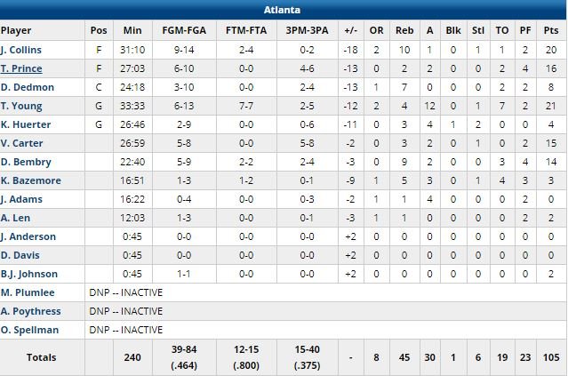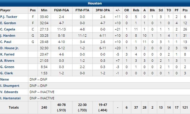 Houston a terminé à 19/47 à 3-points, Atlanta 15/40.