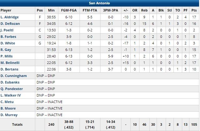 Les Spurs, menés de jusqu’à 12 points, ont réussi à revenir à 108-105 dans le dernier quart sur un floater de Rudy Gay à 1’07, mais un ballon perdu par DeMar DeRozan puis 2 lancers-francs réussis par Kelly Olynyk ont mis fin au suspense. Six joueurs ont terminé à au moins 10 points pour les Texans mais seulement 2 parmi les titulaires. LaMarcus Aldridge a terminé à 17 points, DeRozan à 16. Miami a atteint les 100 points à 9 minutes de la fin alors que les Spurs avaient tenu ses adversaires à 101.3 points par match durant leur série de victoires.