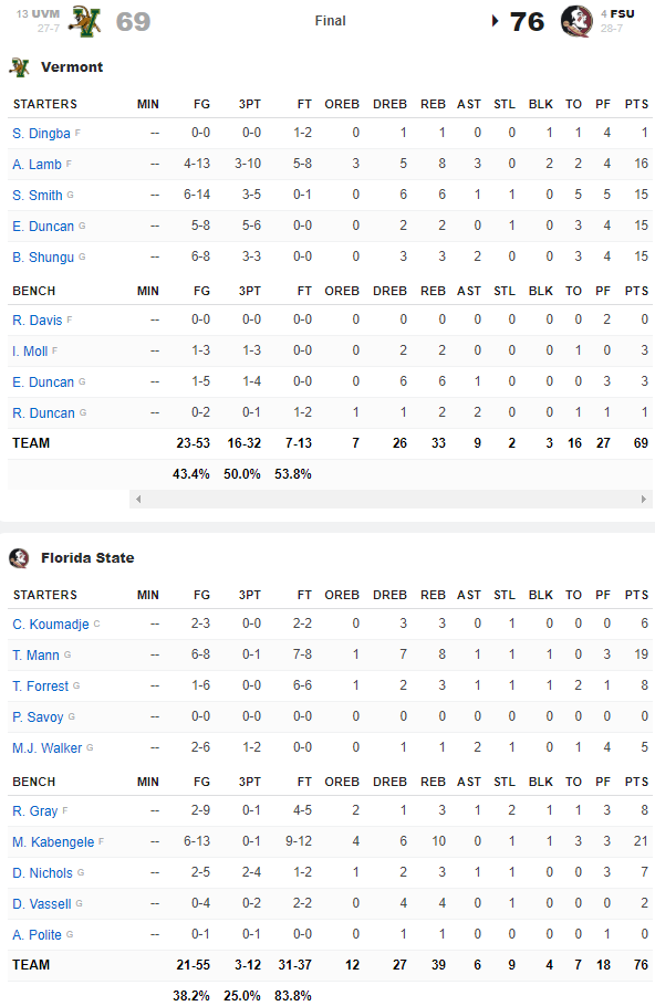 Les Seminoles de Florida State ont eux galéré face à Vermont mais s’en sortent en faisant la différence dans le money time, notamment grâce à Terance Mann (19 points à 6/8).