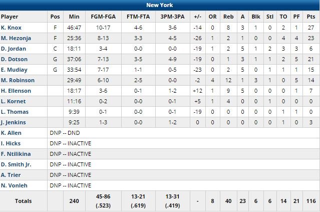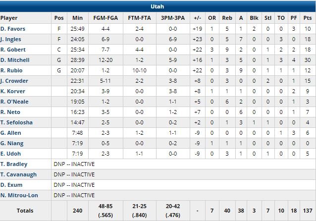Utah, devant de jusqu’à 37 points, a égalé son record de franchise au nombre de 3-points inscrits sur un match grâce à son 20/42 (48%) derrière la ligne. New York (10ème défaite en 11 matchs), sans Dennis Smith Jr. (dos) et Noah Vonleh (cheville) mais avec un Kevin Knox à 27 points et un Mario Hezonja à 23, n’aura au mieux mené qu’une poignée de secondes dans ce match où leurs adversaires ont shooté à 63% sur les 3 premiers quarts.