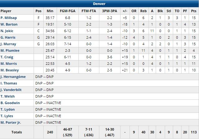 Après avoir bien fêté leur première qualification en 6 ans, les Nuggets n’ont pas levé le pied avec une 5ème victoire de rang obtenue à Washington cette nuit : 113-108. Avec 5 joueurs à 15 points dont Nikola Jokic (6/12, 6 rebonds, 11 passes) et 8 à au moins 10 pour un total de 30 passes décisives, l’équipe s’est à nouveau reposée sur une attaque équilibrée pour l’emporter.