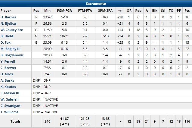 Buddy Hield a signé 11 de ses 29 points (7/13 à 3-points) dans le dernier quart pour les Kings, De’Aaron Fox a signé 15 points et 9 passes et Willie Cauley-Stein 10 points et 18 rebonds. Bagley a ouvert le dernier quart sur un 2+1 sur un layup puis a trouvé un dunk après un raté de Yogi Ferrell avant d’enchaîner deux tirs à 3-points pour donner 19 points d’avance aux siens (116-97). Menés de 15 points en milieu de 3ème quart-temps, les Mavs s’étaient rapprochés à 84-76 sur trois 3-points consécutifs en fin de période.