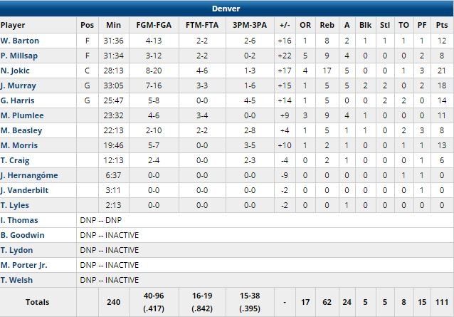 Will Barton a marqué 10 de ses 12 points dans le 1er quart-temps, remporté 37-18 par les Nuggets (dominateurs 62-45 au rebond). Menés de 14 points à la pause, les Knicks sont revenus à 67-59 à 5’52 de la fin du 3ème quart mais leur comeback s’est arrêté là, avec un 1/8 aux tirs pour finir la période. Denver a enchaîné sur un 15-3 avec 7 points de Jokic et un layup de Monte Morris pour tranquillement monter à +20, 82-62, avant de jouer le dernier quart.