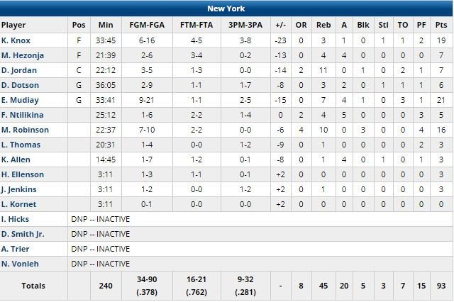 Frank Ntilikina a joué son premier match depuis le 27 janvier (24 matchs manqués). Il a joué 25 minutes en sortie de banc pour 5 points à 1/6 (2/2 aux lancers), 4 rebonds et 5 passes.