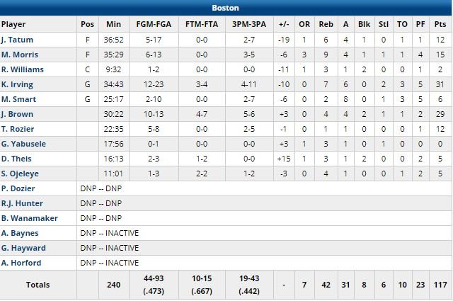 C’est une 3ème défaite d’affilée pour les Celtics (devant 64-63 à la mi-temps), portés par les 31 points (dont 16 dans le 1er quart) à 12/23, 7 rebonds et 6 passes de Kyrie Irving avant de s’effondrer. Dominés 34-26 dans le 3ème, les Hornets se sont retrouvé menés de 18 points à 8’22 avant de marquer sur 12 de leurs 19 possessions suivantes. Boston a de son côté marqué seulement 2 fois sur ses 20 dernières possessions offensives.