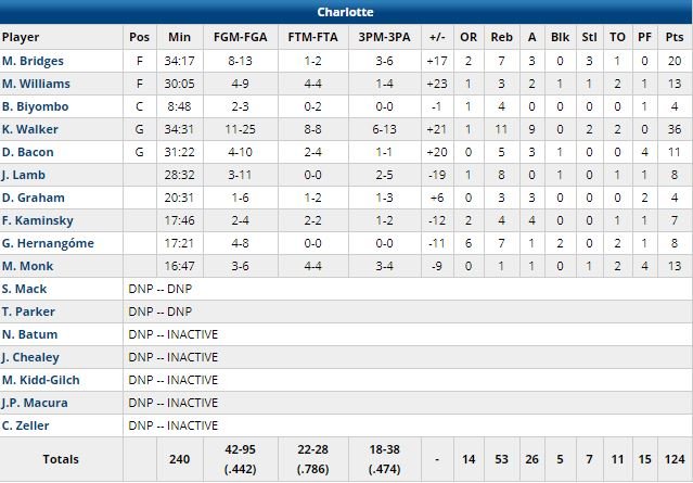 Avec lui, Charlotte a clos son match sur un 30-5 (durant lequel Walker a marqué ses fameux 18 points, dont 2 lancers clutchs à 5.9 secondes du buzzer) après avoir été mené 112-94 à 8’22 de la fin ! Miles Bridges a battu son record en carrière avec 20 points (8/13, 7 rebonds, 3 passes), Marvin Williams et Malik Monk ont signé 13 points chacun et Devonte Graham a lui signé 2 séquences défensives décisives dans le 4ème.