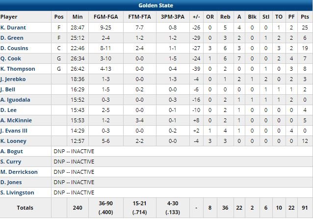 Steph Curry (repos) n’a pas joué mais l’écart de 35 points est quand même très lourd pour les champions en titre, menés par les 25 points à 9/24, 5 rebonds et 4 passes de Kevin Durant. DeMarcus Cousins a fini à 19 points et aucun autre joueur de Golden State n’a atteint les 10 points. Menés 22-7 après le coup de chaud d’entrée de Nowitzki, ils n’ont pas pris l’avantage une seule fois dans ce match. Ils ont littéralement explosé en première mi-temps, dominés 37-22 dans le premier quart puis 37-24 dans le second (74-46 à la pause). Leur maladresse à 3-points explique en partie cette défaite surprise avec un 4/30 seulement derrière la ligne, contre un 21/49 à 3-points pour les Mavericks ! Des Mavs (dont l’avantage est monté jusqu’à 43 points en début de 4ème quart-temps) qui ont mis fin avec cette victoire à une série de 12 défaites à l’Oracle Arena.