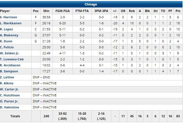 Sans Otto Porter Jr. (épaule) et Zach LaVine (cuisse, genou), c’est Lauri Markkanen qui avait les clés de la maison mais le Finlandais, 18 points et 10 rebonds, a été limité à 6/20 aux tirs. À 5 minutes de la fin du 2ème quart-temps, Kris Dunn (4 points à 1/8) a fini par mettre fin à un 17-0 encaissé par son équipe (dominés 62-50 dans la peinture), sous les applaudissements un poil moqueur du United Center.