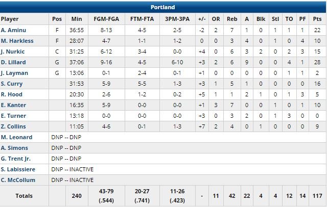 Portland a ensuite tenu ses adversaires à zéro point pendant près de 4 minutes dans le 4ème. Nurkic a égalisé à 109 partout à 1’48 sur un layup puis les Blazers ont réussi un stop qui a permis à Lillard de convertir un 3+1 derrière (113-109 à 1’37). Griffin a manqué une tentative à 3-points derrière, Portland a répondu par un dunk de Nurkic sur Griffin (115-109). Langston Galloway a ramené Detroit à 115-112 à 31 secondes avant de contrer Lillard sur une tentative de layup mais Aminu a récupéré le ballon et conclu sur un layup à 4.1 secondes.