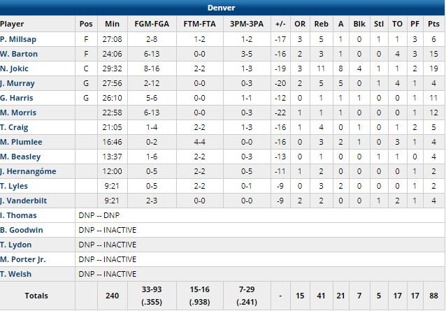 Pas bon pour la course à la 1ère place pour les Nuggets de Nikola Jokic (19 points, 11 rebonds et 8 passes), Will Barton (15 points) et Monte Morris (12 points), relégués en seconde position par les Warriors après cette 1ère défaite en 7 rencontres. Bogdanovic a marqué tous les points d’un 12-2 en faveur des locaux en fin de 2ème quart. À 2’53 de la mi-temps, il a rentré un 3-points qui a donné 17 points d’avance à Indiana, 52-35. Indiana est rentré au vestiaire en tête 62-46 et Denver n’a jamais réussi à revenir sous les 11 points en seconde mi-temps. Un dunk de Kyle O’Quinn a porté l’écart à 41 points (121-80) à 1’30 de la fin !