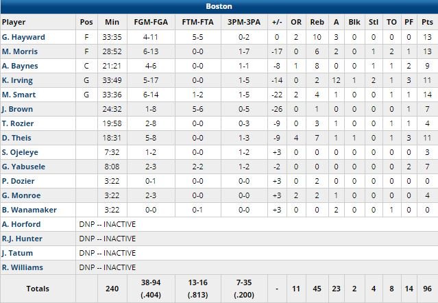 Marcus Smart a terminé meilleur marqueur des Celtics avec… 14 points devant Kyrie Irving (11 points à 5/17, 12 passes). Le meneur a quitté le match brièvement dans le 1er quart-temps sur une blessure à la main gauche puis est revenu et a joué le reste du match avec un bandage sur l’annulaire gauche. Après seulement 2 minutes de jeu dans le dernier quart, l’écart était de 16 points, et est monté jusqu’à 25 dans la période.