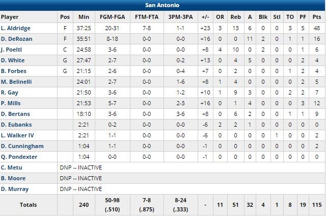 Aldridge a réussi 8 de ses 12 premiers tirs et comptait 20 points en moins de 10 minutes. Il a terminé la mi-temps (dominée 54-47 par San Antonio) à 25 points et a été sorti par Gregg Popovich à 1’35 de la fin lorsqu’il a pris sa 5ème faute.