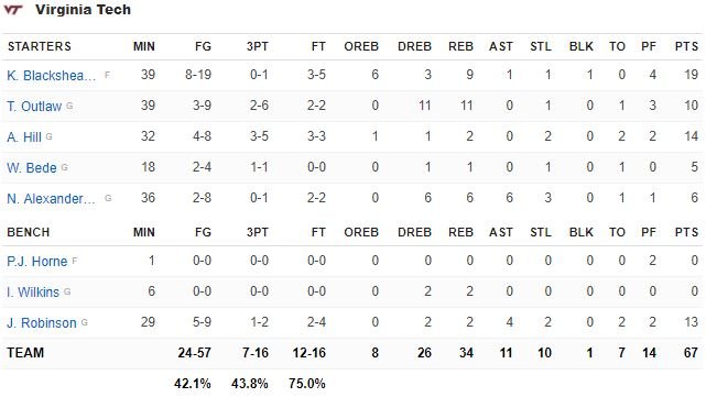 Virginia Tech, mené par les 19 points et 9 rebonds de Kerry Blackshear Jr., jouera son premier Sweet 16 depuis 1967 grâce à sa victoire 67-58 sur Liberty. Dominés 32-29 en 1ère mi-temps, l’équipe a survolé la 2ème 38-26.