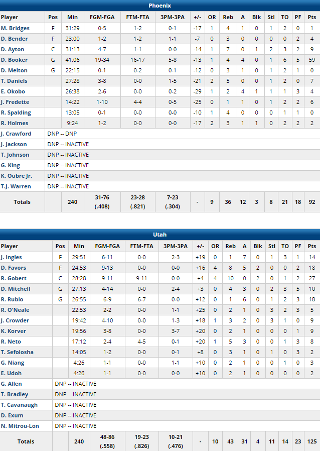 Le Jazz a pris les commandes de la rencontre en milieu de premier quart et ne les a ensuite plus lâchées. Les 12 premières minutes ont été équilibrées et se sont terminées sur un score de 26-21 mais les locaux se sont envolés dans le second quart. Malgré 18 points de Booker dans le quart, Utah a passé un terrible 14-0 conclu par un 3-pts de Mitchell pour mener 40-23. Avec un 36-22 sur le quart, Utah a rejoint les vestiaires avec un avantage 62-43. Booker a permis aux siens d’entretenir l’espoir dans le 3ème acte en plantant 20 points mais sans pouvoir pour autant faire de run et les ramener dans le sillage d’Utah. A l’entame du dernier acte il y avait encore 14 points d’avance mais le festival de dunks du Jazz s’est poursuivi sous l’impulsion de Derrick Favors pour recreuser l’écart. L’écart est ainsi monté à 31 points, game over.