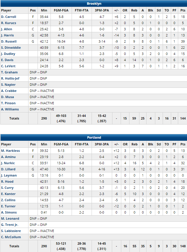 Les deux équipes ont été maladroites en début de seconde mi-temps mais Nurkic a mis les siens en tête, dominateur à l’intérieur avec les 6 fautes d’Allen et Davis. Mais est survenu sa blessure. Remplacé par Anfernee Simons, ce dernier a mis les deux lancers, et Hood a enfoncé le clou à 3-pts, 139-132. Au jeu des fautes et des lancers Brooklyn n’a pas pu revenir.