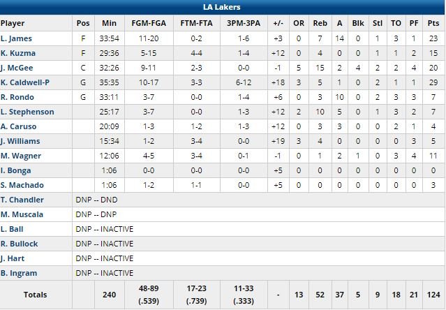 Avec 23 points (11/20, 1/6 à 3-points, 0/2 aux lancers), 7 rebonds et 14 passes de LeBron James, 29 points (10/17, 5 rebonds) de Kentavious Caldwell-Pope et 20 points (9/11, 15 rebonds et 4 contres) de JaVale McGee, les Lakers ont remporté un 2ème match consécutif pour la première fois depuis mi-janvier cette nuit, avec un succès 124-106 obtenu aux dépens des Wizards.