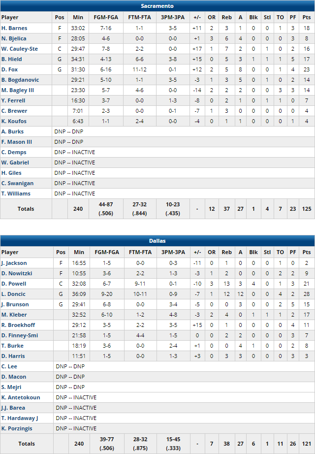 Les Kings restent théoriquement encore en vie pour les playoffs en dominant les Mavs 125-121 dans un match qui s’est joué dans les deux dernières minutes. De’Aaron Fox (23 points à 6/16 et 8passes) et Buddy Hield (17 points à 4/13) ont été décisifs pour Sacramento avec un 7-1 eux deux qui a fait la différence. En face Luka Doncic a pourtant fait tout ce qu’il a pu avec 28 points à 9/20 mais 0/9 à 3-pts, 12 rebonds et 12 passes, en vain.