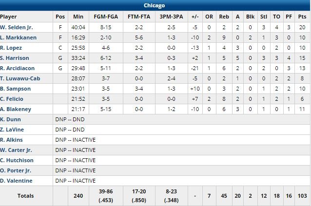 À noter : les 8 points à 3/7 (2/4 à 3-points), 2 rebonds et 1 passe de Timothé Luwawu-Cabarrot en 28 minutes pour Chicago.