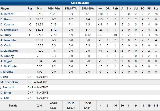 51ème victoire de la saison et 4ème succès en 5 matchs pour les Warriors, vainqueurs 118-103 à Memphis cette nuit. Kevin Durant a signé le meilleur pourcentage de sa carrière avec 28 points à 12/13 (9 rebonds et 5 passes), Stephen Curry a mis autant de points avec un 7/20 aux tirs mais un 6/12 à 3-points en plus de 10 rebonds, 7 passes et 2 contres et DeMarcus Cousins a terminé à 16 points à 7/15, 9 rebonds, 6 passes, 3 contres et 3 interceptions pour la 1ère équipe de l’Ouest devant Denver (50-23).