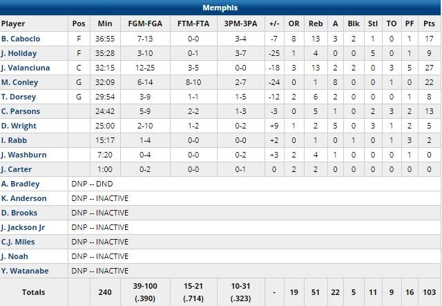 Jonas Valanciunas a terminé meilleur marqueur des Grizzlies avec 27 points et 13 rebonds, Mike Conley a signé 22 points (il est devenu le meilleur scoreur de la franchise) et 8 passes et Bruno Caboclo 17 points et 13 rebonds. Menés 37-31 après 12 minutes, les Warriors ont réagi avec un 35-23 dans le 2ème quart et sont rentrés au vestiaire devant 66-60.