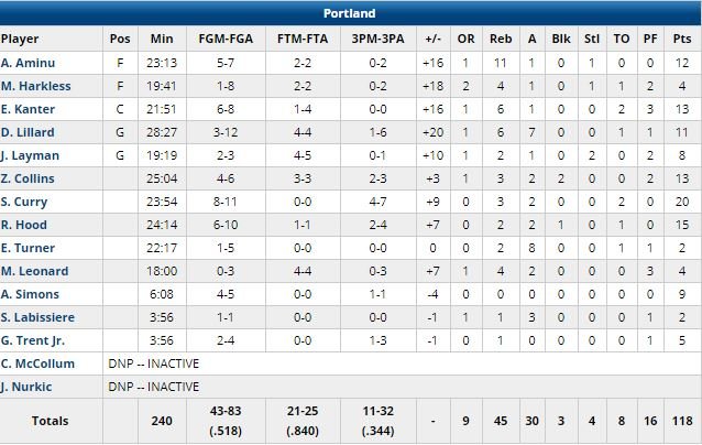 Même sans Jusuf Nurkic, les Blazers n’ont pas eu de mal à dominer Chicago 118-98 cette nuit. Seth Curry a terminé meilleur marqueur des siens (5ème victoire consécutive) avec 20 points à 8/11 alors que Damian Lillard n’a pas brillé (11 points à 3/12, 6 rebonds, 7 passes), Rodney Hood a ajouté 15 points, Enes Kanter (titulaire, 21 minutes de jeu) et Zach Collins 13 chacun.
