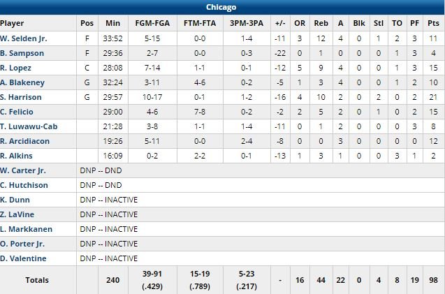 En l’absence de LaVine (cuisse, genou), Porter Jr. (épaule), Dunn (dos) et Markkanen (tachycardie, fatigue), les Bulls ont été menés par une career-night de Shaquille Harrison, auteur de 21 points et 10 rebonds, devant les 15 et 9 de Robin Lopez. Cela n’a pas empêché l’équipe de tomber pour la 8ème fois en 10 rencontres.
