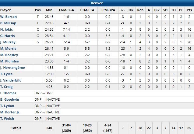 À 16/52 à 3-points face aux Bucks, ils ont cette fois tentés moins de tirs longue distance (40) mais ont fini à 15 réussites de loin, dont 5 pour Harden, 4 pour Eric Gordon et 3 pour Austin Rivers. Jamal Murray a terminé meilleur marqueur des Nuggets (4/24 à 3-points), qui perdent pour la 2ème fois en 3 matchs après une série de 6 succès.