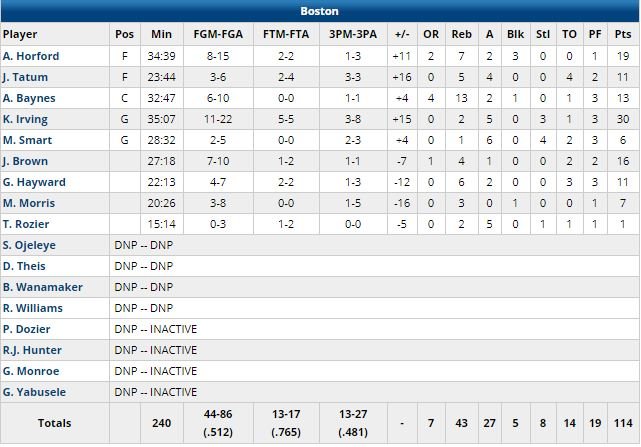 Une perte de balle des Celtics sur remise en jeu a redonné le ballon aux visiteurs mais Collison a raté un jump shot à 10.2 secondes, laissant tout juste le temps à Irving d’aller déposer le ballon dans le cercle sur l’action suivante.