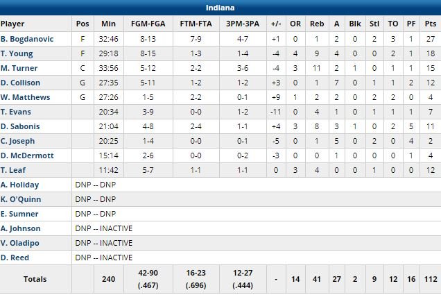 Al Horford a ajouté 19 points et 7 rebonds, Aron Baynes 13 points et 13 rebonds. Bojan Bogdanovic a mené Indiana avec 27 points, Thaddeus Young 18 points et 9 rebonds, Myles Turner 15 points et 11 rebonds. Les deux équipes se retrouveront vendredi à Indianapolis. Le match a compté 10 égalités et 6 changements de leader. Devant 105-99 en début de 4ème quart après avoir empêché leurs adversaires de marquer le moindre panier dans le jeu pendant 2’42, Boston a subi un 6-0 et Indiana a égalisé à 105 partout à 4 minutes de la fin. Nouvelle égalité 107 partout sur un 3-points de Marcus Smart en fin de possession quelques instants plus tard, puis une réponse de Darren Collison derrière la ligne de l’autre côté. Young a ensuite laissé passer une chance de donner l’avantage aux siens alors que le score était de 112-112 à moins d’une minute sur un layup manqué.