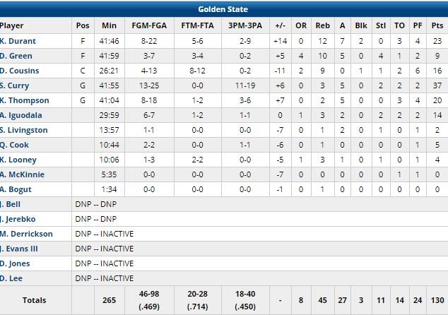 Les Warriors ont mené de jusqu’à 19 points en 1ère mi-temps avant d’encaisser un 32-18 dans le 3ème quart-temps. Tolliver sur un 3-points a donné un premier avantage à Minnesota depuis le début du 1er quart et l’équipe est montée jusqu’à +9 dans le 4ème avant l’égalisation à 115 partout par un lancer-franc de Draymond Green à 21 secondes de la fin. Wiggins a laissé passer 2 chances de gagner le match dans les dernières secondes du 4ème quart-temps.