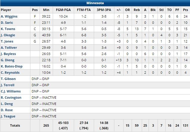 En prolognation, Tolliver, Bayless et Okogie ont chacun rentré un 3-points pour permettre à Minnesota de prendre 9 points d’avance mais Curry durant le run cité plus haut a égalisé à 3-points, juste après un 3-points de Durant qui semblait avoir remis les compteurs à zéro mais qui a finalement été jugé non valable pour une faute de Keita Bates-Diop avant le tir. Klay Thompson a terminé à 20 points pour les Warriors, qui n’ont toujours pas gagné en prolongation cette saison (0-5).