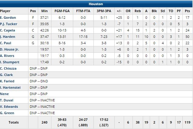 Son 5ème match en carrière (2ème cette saison) en triple-double avec au moins 50 points. C’est 2 de plus que Russell Westbrook, 2ème au classement dans l’histoire de la ligue. Oh, et il a marqué 10 points d’affilée dans le money time pour aider son équipe à l’emporter. Revenu en jeu à 7 minutes de la fin, Harden a marqué tous les points d’un 10-2 qui a fait passer l’avance des siens d’un à 9 points (111-102) à 3 minutes de la fin. Il a ensuite poussé le score à 113-104 après avoir capté le rebond d’un raté de Marvin Bagley (20 points, 12 rebonds) et servi Clint Capela (24 points, 15 rebonds) pour le dunk.