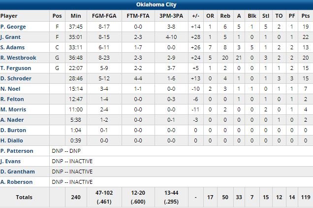 En dehors de Westbrook, 5 autres joueurs du Thunder (33 passes décisives) ont terminé à au moins 10 points, dont Jerami Grant (22) et Paul George (19, 6 rebonds, 5 passes). En 1968, Chamberlain avait compilé 22 points, 25 rebonds et 21 passes.