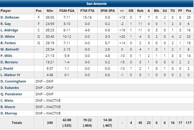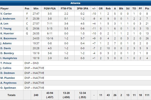 Rudy Gay, 11 rebonds, a été le seul titulaire des Spurs à ne pas terminer à au moins 10 points. Trae Young a joué 29 minutes pour 15 points à 5/15 et 6 passes. Il a manqué toutes ses tentatives derrière la ligne (0/6).