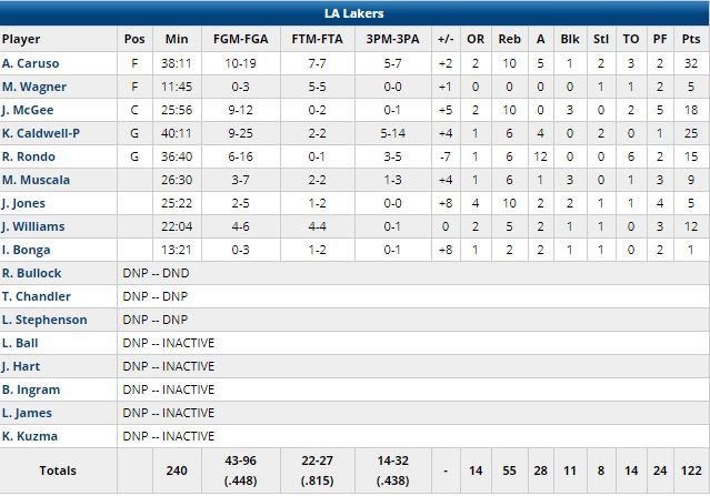 Les joueurs de Luke Walton ont fait particulièrement mal à ceux de Doc Rivers dans le 4ème quart-temps (remporté 35-23), avec 8 tirs à 3-points réussis dans la période, dont sur 4 possessions consécutives. Rondo et Caruso en ont mis 3 chacun. Les Clippers sont revenus à 118-115 sur un 3-points de Danilo Gallinari (27 points à 8/18, 6 rebonds, 8 passes, 2 contres) mais Caruso (two-way contract) a répondu par un layup, comme il l’avait déjà fait sur la possession précédente. Shai Gilgeous-Alexander (20 points) a à nouveau réduit l’écart à 3 points, KCP a rentré 2 lancers-francs et Gilgeous-Alexander a perdu le ballon dans les dernières secondes.