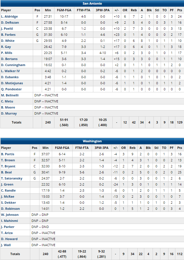 Les Texans ont fait parler leur collectif et leur attaque avec 8 joueurs à au points 10 points dont 24 points à 10/17 pour LaMarcus Aldridge, 18 points pour Rudy Gay 17 pour Bryn Forbes et Patty Mills alors que DeMar DeRozan en ajoute 16. Les hommes de Gregg Popovich ont shooté à 56% dont un excellent 10/25 à 3-pts et perdu seulement 9 ballons, la recette parfaite pour s’imposer puisqu’ils ont en plus pris 12 rebonds offensifs. En face les Wizards sont moins en réussite (47.7%) à l’image de leur 9/32 derrière l’arc. Ils ont été menés par les 25 points de Bradley Beal et les 19 points de Thomas Bryant.