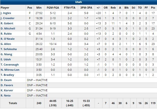 Aucun problème pour un Jazz en mode cadenas cette nuit dans sa victoire 119-98 sur les Kings. Ces derniers ont été limités à 30% dans le 1er quart-temps, ont rapidement pris 10 points de retard et ne s’en sont jamais remis. Pour Utah, porté par les 23 points chacun de Donovan Mitchell (9/19, 5 rebonds, 9 passes) et Grayson Allen (10/14) mais aussi les 17 points à 6/10, 11 rebonds, 4 contres et 3 interceptions de Rudy Gobert et les 17 points à 5/12, 4 rebonds et 7 passes de Joe Ingles, c’est une 7ème victoire consécutive. Ce nouveau succès permet aussi au Jazz, 5ème à l’Ouest (49-30), d’égaler son record de victoires de la saison dernière.